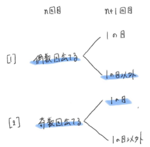 [2] \(n\) 回目までに \(1\) の目が奇数回出て、\((n+1)\) 回目に \(1\) の目が出る確率