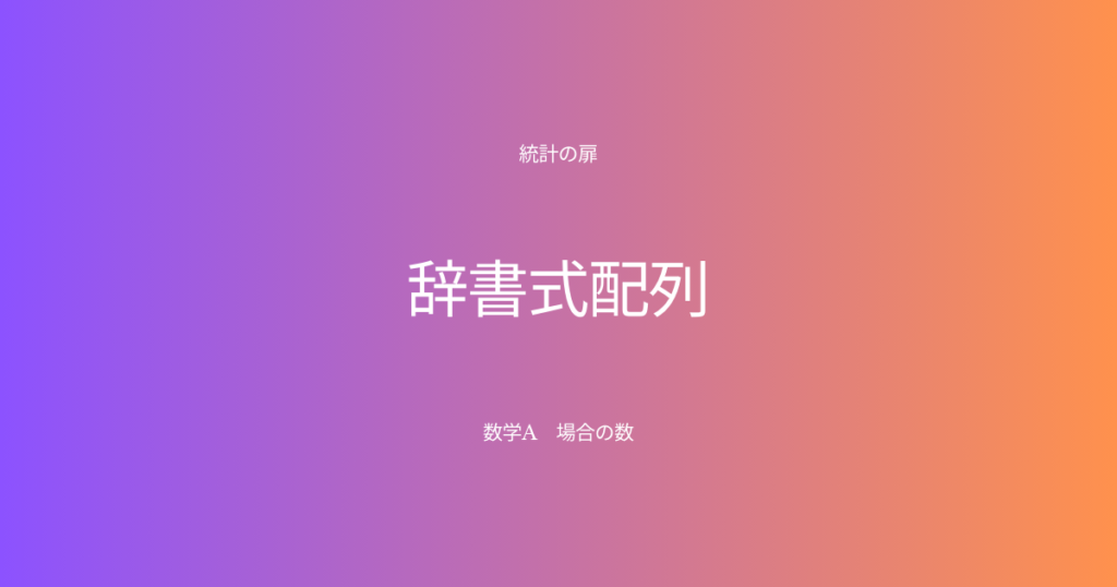 辞書式に配列する場合の数 今回は辞書式に配列させる場合の数の問題です! みなさん辞書を引いたことはありますか?例えば、 ① あんこ ② カステラ ③ あんぱん こ... -