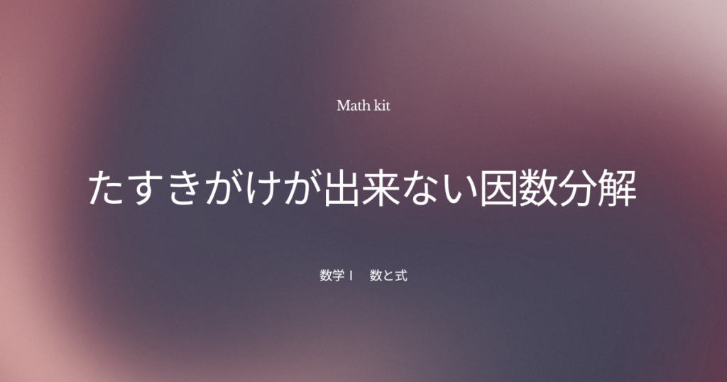 たすきがけが出来ない場合の因数分解 今回は ”たすきがけ” が使えない因数分解の問題です。 ほとんどの因数分解はたすきがけで解決します。しかし、中にはたすきがけが... -